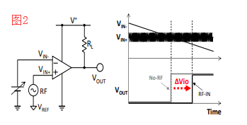 圖1和圖2顯示了運算放大器和比較器的失調(diào)電壓偏移,當射頻信號被照射時從簡單的天線到安裝設(shè)備的測試板,設(shè)備的輸入偏移電壓會波動,并導(dǎo)致晶振輸出信號偏移或閾值電壓偏移,我們在本應(yīng)用筆記中將此現(xiàn)象稱為"偏移電壓偏移",這種"偏移電壓偏移"可能導(dǎo)致故障電子設(shè)備,RF信號傳播到器件,引起偏移電壓偏移,其所考慮的RF信號線包括PCB圖案,電纜,封裝的引線和器件的鍵合線,但是,由于RF信號的波長(例如,在2.4GHz處為13cm,在900MHz處為33cm)足夠長封裝引線和焊線(幾毫米),PCB圖案或電纜通常用作天線,何時用作天線RF信號到達引腳,導(dǎo)致偏移電壓偏移.