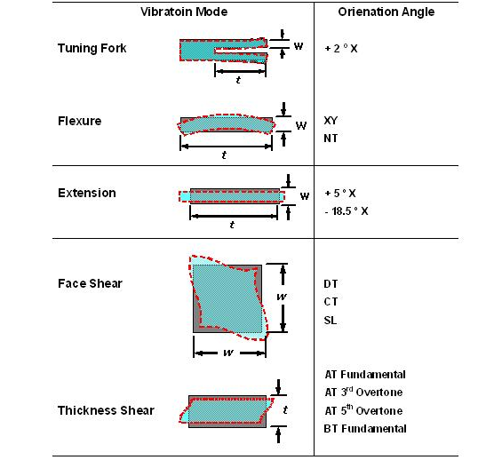 經(jīng)由不同的石英切割角度及不同電極型狀的電場(chǎng)效應(yīng), 石英芯片展現(xiàn)了各種不同的振動(dòng)模態(tài). 以經(jīng)常產(chǎn)生的振動(dòng)模態(tài)可以概分為擾曲模態(tài)(flexure mode), 伸縮模態(tài)(extension mode), 面剪切模態(tài)(face shear mode) 和 厚度剪切模態(tài)(thickness shear mode). 這幾種振動(dòng)模態(tài)以簡(jiǎn)單的方法在表一中可以看到. 在實(shí)際狀況中, 石英芯片并不是一定祇有單一種振動(dòng)模態(tài), 而可能有多種模態(tài)同時(shí)存在在一個(gè)石英芯片的振蕩中, 經(jīng)由適當(dāng)?shù)脑O(shè)計(jì), 可以壓制其它不希望產(chǎn)生的振動(dòng)模態(tài)(unwanted mode), 來(lái)達(dá)到主要振動(dòng)模態(tài)的最佳化..jpg)