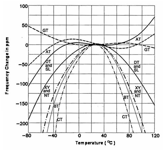 大部份的石英晶體產(chǎn)品是用于電子線路上的參考頻率基準或頻率控制組件, 所以, 頻率與工作環(huán)境溫度的特性是一個很重要的參數(shù). 事實上, 良好的頻率與溫度(frequeny versus temperature)特性也是選用石英做為頻率組件的主要因素之一. 經(jīng)由適當?shù)亩x及設計, 石英晶體組件可以很容易的就滿足到以百萬分之一 (parts per million, ppm) 單位等級的頻率誤差范圍. 若以離散電路方式將LCR零件組成高頻振蕩線路, 雖然也可以在小量生產(chǎn)規(guī)模達到所需要的參考頻率信號誤差在ppm或sub-ppm等級要求, 可是這種方式無法滿足產(chǎn)業(yè)要達到的量產(chǎn)規(guī)模. 石英組件的頻率對溫度特性更是離散振蕩線路無法簡易達成的. 在左圖中提供了數(shù)種不同的石英晶體切割角度的頻率對溫度特性曲線.