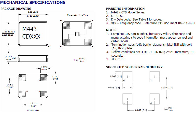 CTS晶振,貼片晶振,443晶振,石英晶體諧振器,低頻晶振可從12MHz起對應(yīng),小型,超薄型具備強防焊裂性,石英晶體在極端嚴酷的環(huán)境條件下也能發(fā)揮穩(wěn)定的起振特性,產(chǎn)品本身具有耐熱,耐振,耐撞擊等優(yōu)良的耐環(huán)境特性,滿足無鉛焊接以及高溫回流溫度曲線要求