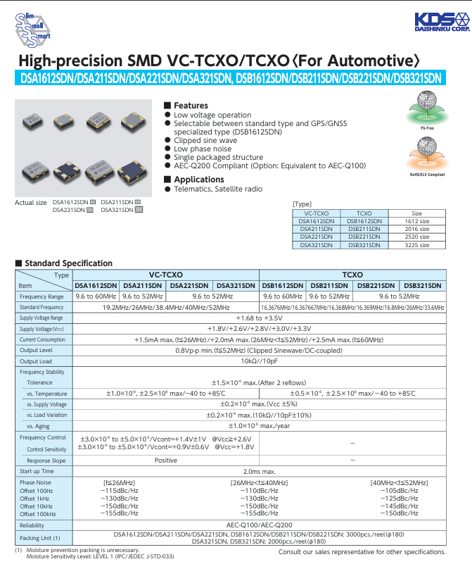 這款VC-TCXO有源晶振的核心優(yōu)勢,在于其對極端環(huán)境的超強適應力.作為符合AEC-Q200標準的車規(guī)產(chǎn)品,它能在-40℃至+85℃的寬溫區(qū)間內穩(wěn)定運行,頻率偏差控制在±1.0×10??以內.這種嚴苛環(huán)境下的穩(wěn)定性,恰是車載系統(tǒng)的生命線——進口晶振無論是遠程信息處理傳輸數(shù)據(jù),還是衛(wèi)星廣播接收信號,微小的頻率偏差都可能導致通信中斷.而其低相位噪聲特性,更讓信號傳輸如“靜水行舟”,在10kΩ//10pF的負載條件下,相位噪聲指標可達-155dBc/Hz,為車載通信筑起抗干擾的“防護盾”.KDS溫補晶振,大真空有源晶振石英晶振
