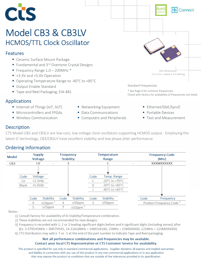 CB3LV-3I-50M000000美國(guó)CTS西迪斯 四腳7050 50M XO HCMOS TTL 3.3V 50PP -40+85
