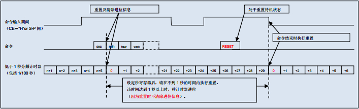 執(zhí)行重置時不清除進位信息,為此請在設(shè)定秒寄存器后不到1秒的時間內(nèi)重置低于1秒的計時器;