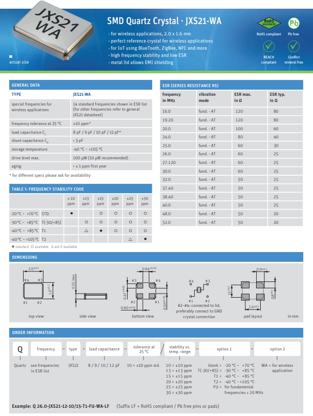 | Q 16.0-JXS21-9-10/15-T1-WA-LF | Jauch Quartz | JXS21-WA | 16MHz | ±10ppm | 9pF | -40°C ~ 85°C | 4 | (2.00mm x 1.60mm) |