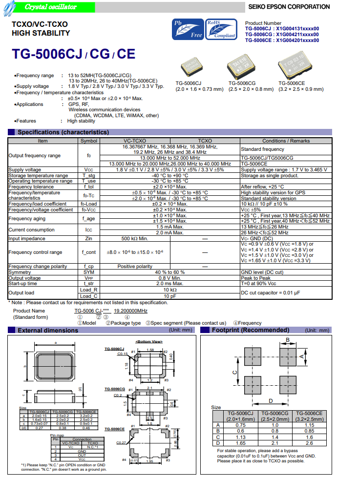 | X1G0041310009 | TG-5006CJ | 19.200000 MHz | 2.00 x 1.60 x 0.73 mm | Clipped sine wave | -30 to +85 °C | +/-1ppm | +/-2.0 ppm |